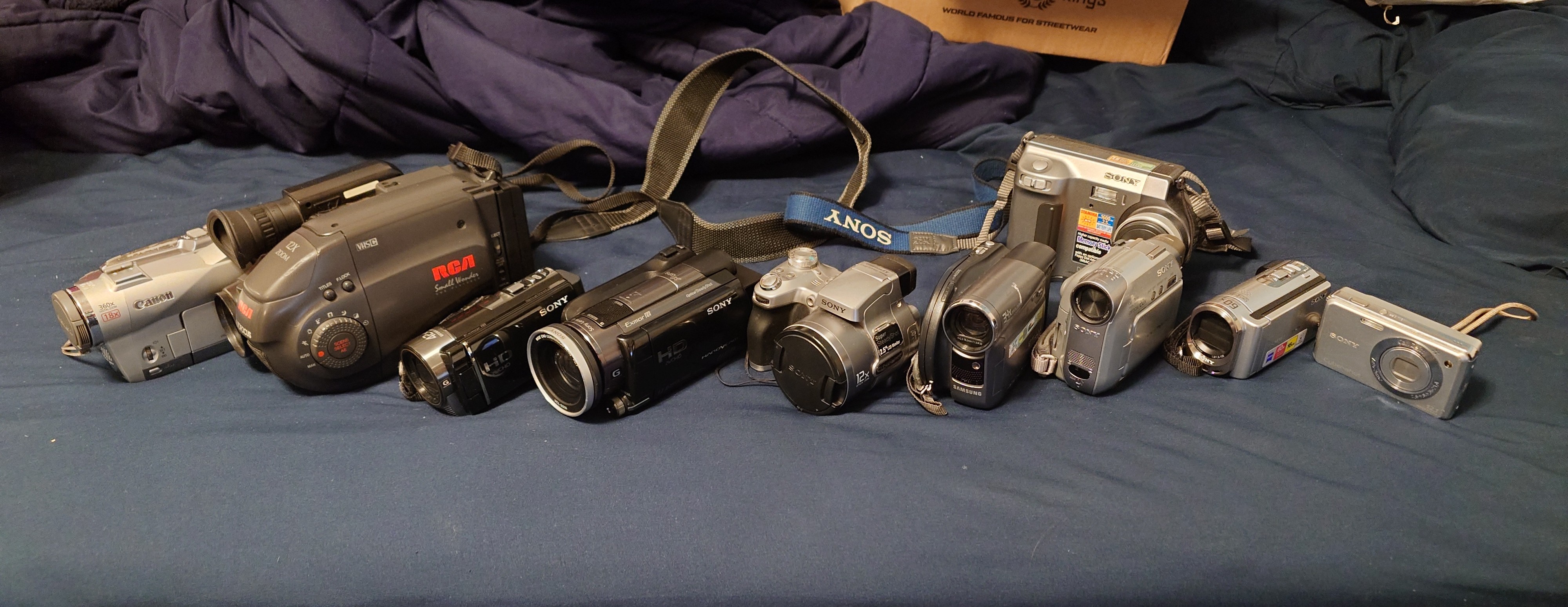 Today I finally received the mini DVDs that I needed for my Samsung camcorder, and it took a little bit to figure out because I had never used mini DVD, which ended up leading to me ruining one of the discs I bought. Luckily I got three so second time was the charm and it works perfectly. Worth the money if you ask me. Anyway, I've now got a pretty robust camera collection. Only one of them doesnt work properly, but all work to some good extent. I even got the RCA camcorder confirmation that it records fine since it took me finding my RCA cable doesnt work anymore, but the RCA camera came with all original accessories so I was able to use that camera. I havent actually posted a picture of any of these cameras on here, just a table talking about them in Camera Collection, so heres all of them.
